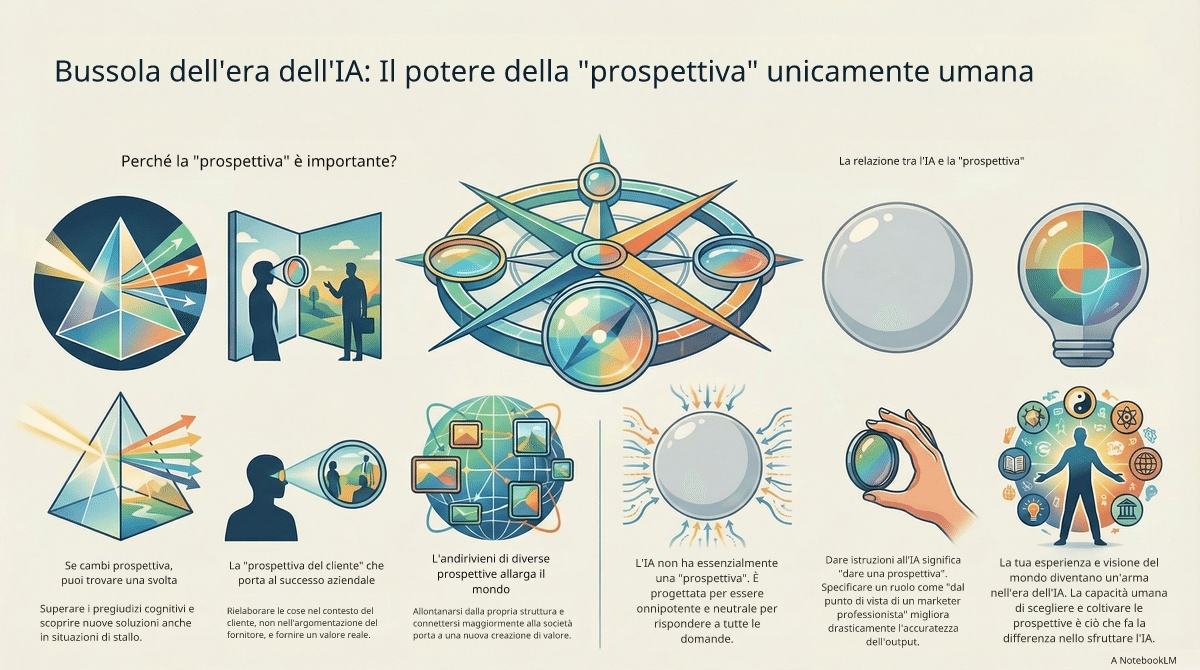 E, a ben vedere, dare direzione all’IA significa, in ultima analisi, darle un punto di vista. Esistono molti punti di vista: quello del campo, quello del capo, quello del cliente; quello del cliente del cliente (punto di vista concatenato); ancora più in generale quello del cittadino/consumatore nella vita quotidiana; quello del futuro, che guarda avanti, e così via. Quale punto di vista scegliere, in che ordine alternarli e fin dove approfondirli dipende dalla tua esperienza, dalle tue conoscenze e dalla tua visione del mondo. Proprio per questo, la capacità di padroneggiare l’IA non si affina solo con l’abilità operativa: si affina aumentando continuamente la gamma dei punti di vista che si possono assumere.