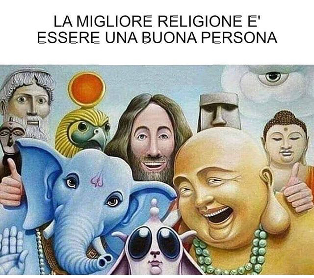 Pubblico questa simpatica immagine così come l'ho ricevuta. Immagino che, per chi l'ha disegnata (non conosco la fonte), non sia stato possibile includere un personaggio per ogni religione esistente, però il messaggio è comunque chiaro.